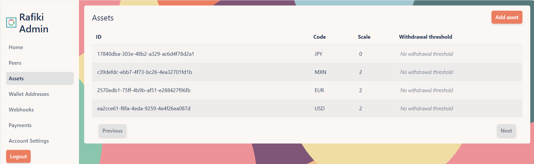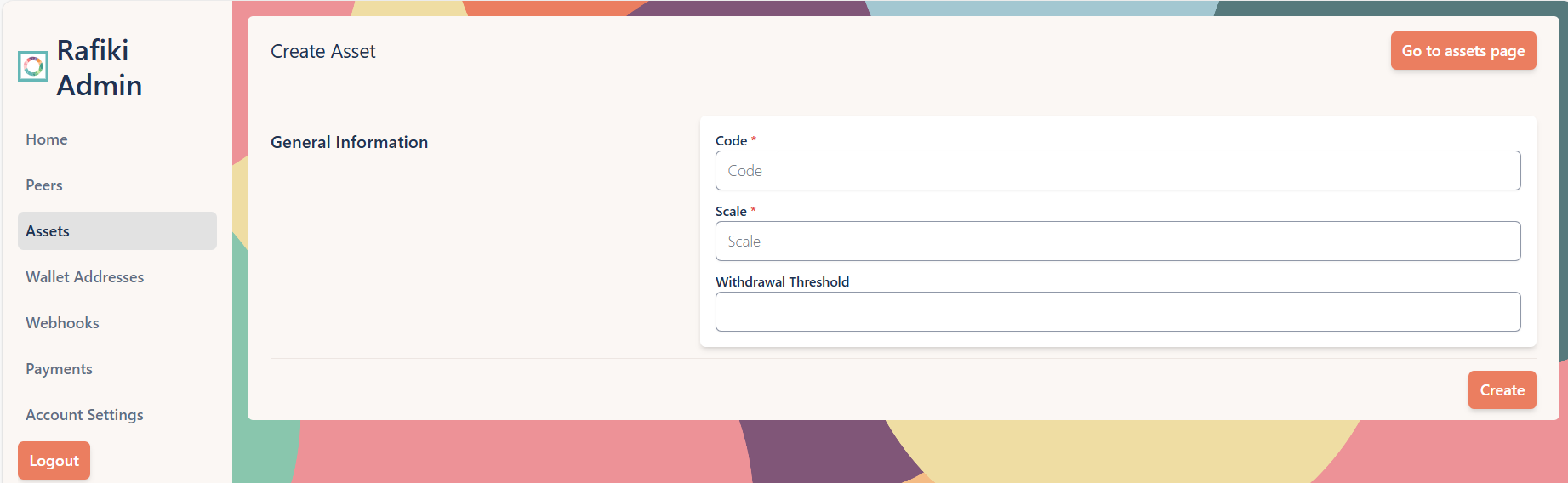 The Assets page allows you to manage assets in your Rafiki instance, including viewing, editing, and creating assets.