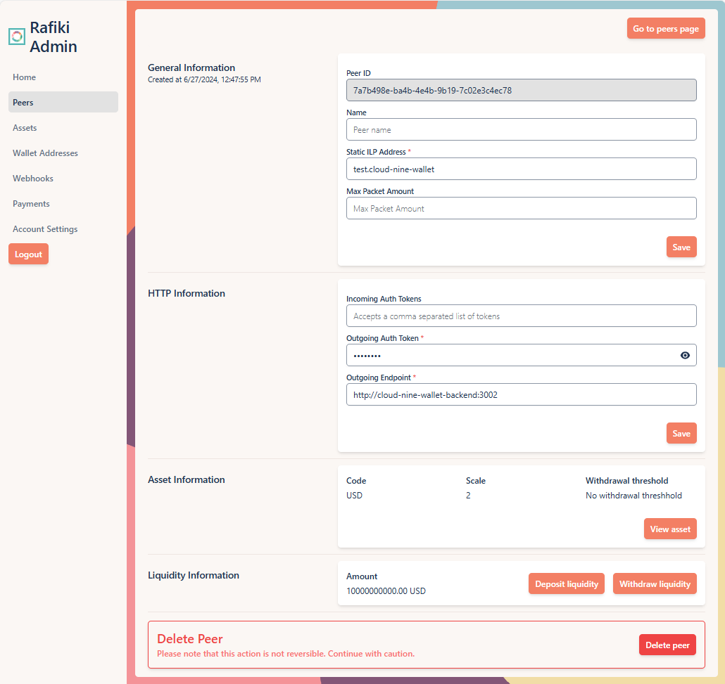 | General Information | Peer ID | A unique identifier assigned by Rafiki when the peer was created. This cannot be changed. |