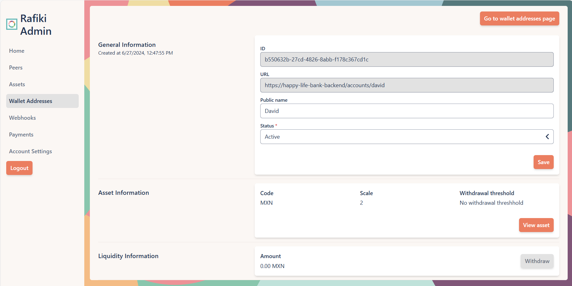 | General Information | ID | A unique identifier assigned by Rafiki when the wallet was created. This cannot be changed. |