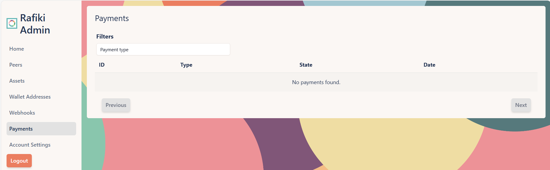 The Payments page allows you to view all incoming and outgoing payments in your Rafiki instance. This allows you to monitor payment activity as well as track the status of payments.