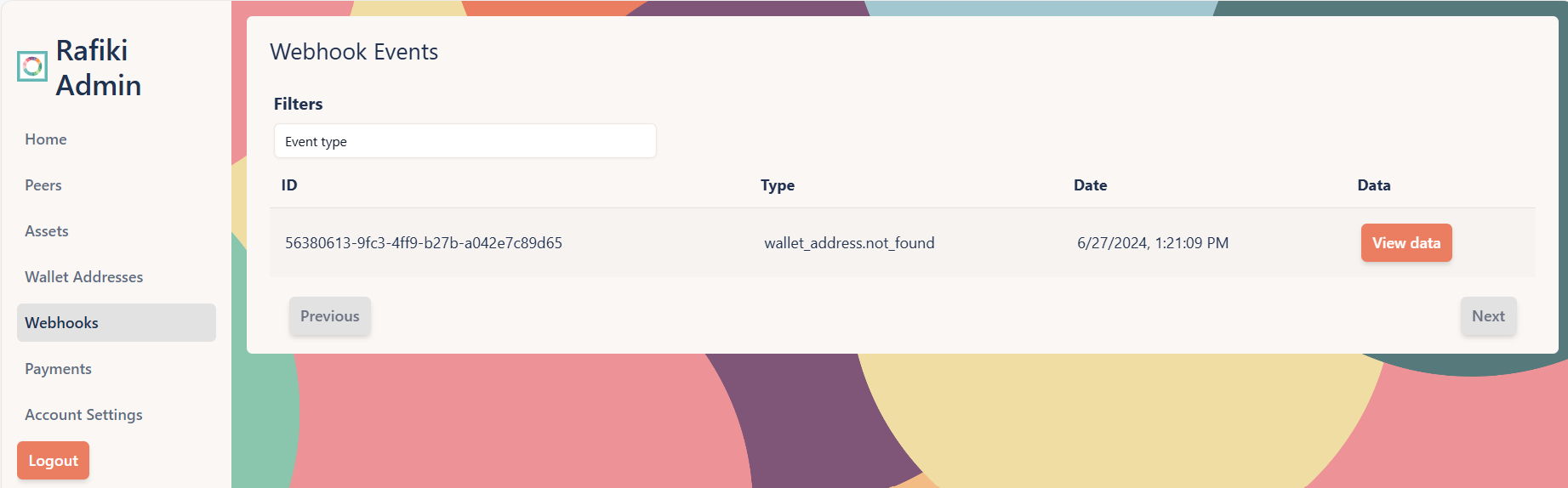 The Webhook Events page allows you to monitor and manage webhook events within your Rafiki instance. Webhook events in Rafiki are the main communication channel between you and your Rafiki instance. See Webhook events for more information about webhook events.